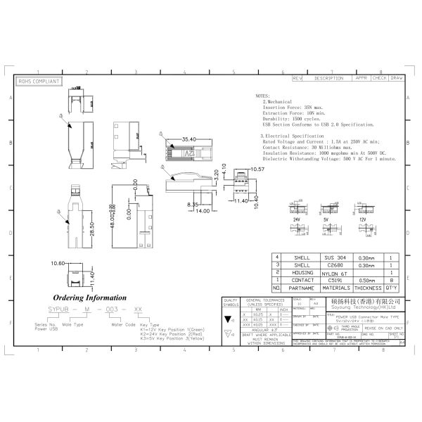 3.0Amp Large Current Power Usb Connector Male Solder Type 5V 12V 24V